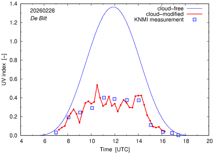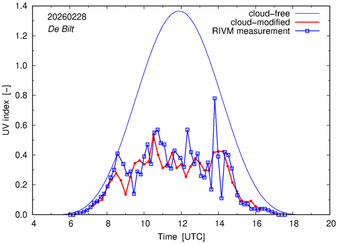 Comparison of the cloud-modified UV index with RIVM and KNMI UV index measurements is based on the higher resolution (0.05 by 0.05°) data using the location of 'De Bilt' for both institutes and is available up to yesterday.