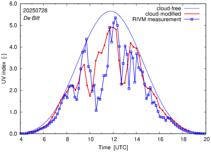 Comparison of the cloud-modified UV index with RIVM and KNMI UV index measurements is based on the higher resolution (0.05 by 0.05°) data using the location of 'De Bilt' for both institutes and is available up to yesterday.
