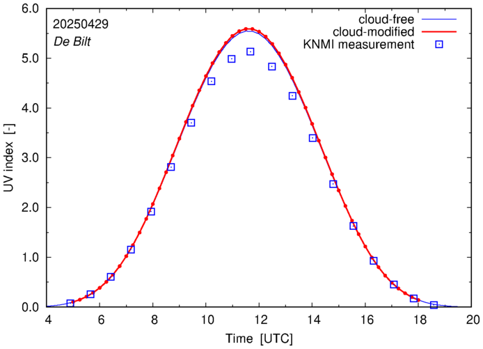 Comparison of the cloud-modified UV index with RIVM and KNMI UV index measurements is based on the higher resolution (0.05 by 0.05°) data using the location of 'De Bilt' for both institutes and is available up to yesterday.