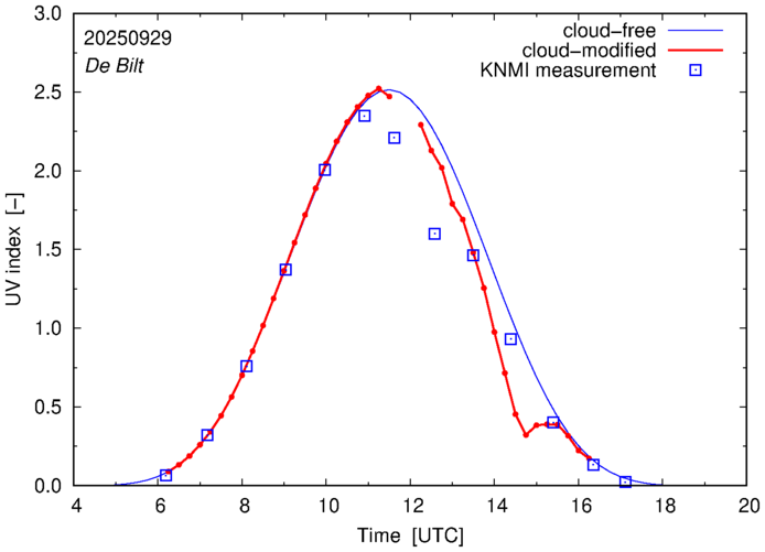 Comparison of the cloud-modified UV index with RIVM and KNMI UV index measurements is based on the higher resolution (0.05 by 0.05°) data using the location of 'De Bilt' for both institutes and is available up to yesterday.