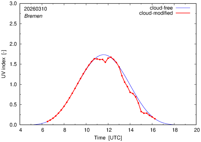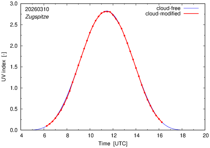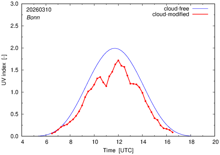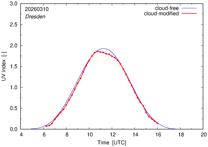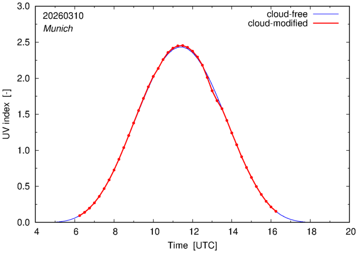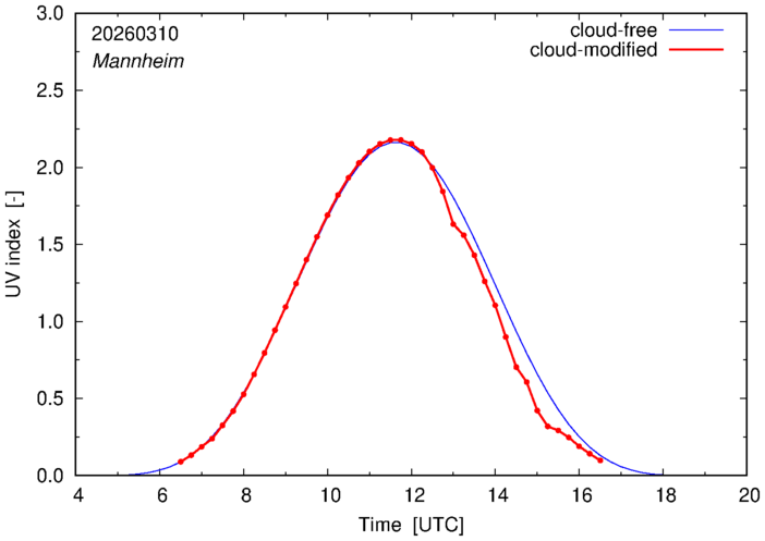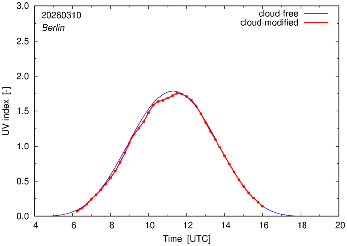 The plots on this page show for selected places in Germany the UV index throughout the day, both cloud-free (thin blue line) and cloud-modified (red line/points) -- if the latter is absent, then cloud cover data is not available.