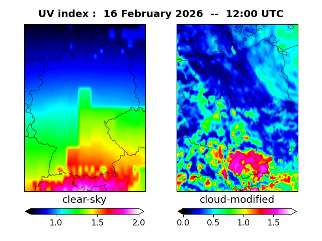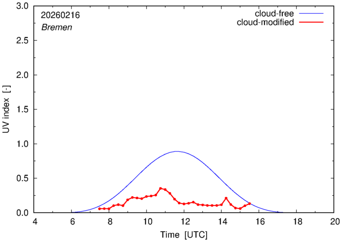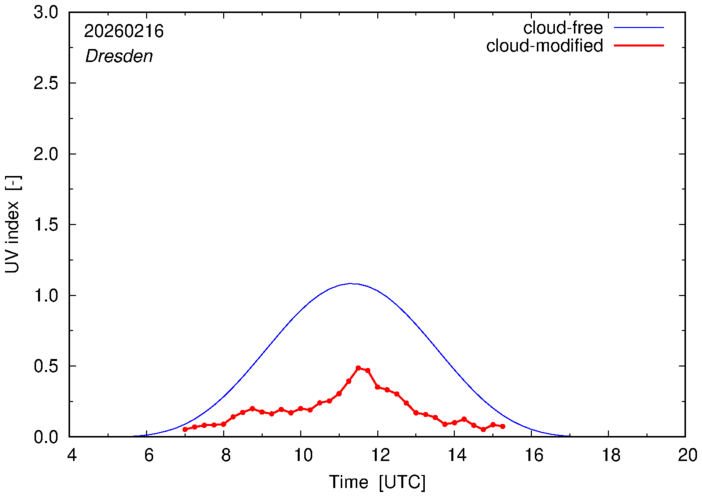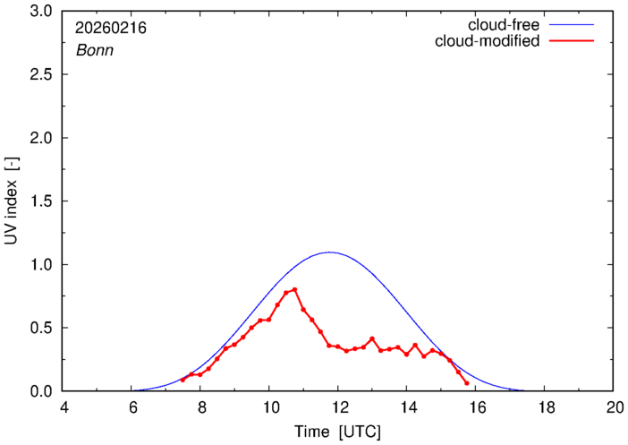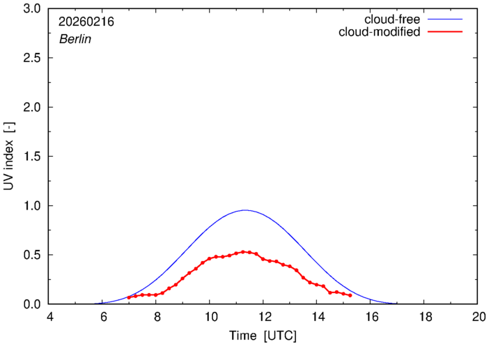 The plots on this page show for selected places in Germany the UV index throughout the day, both cloud-free (thin blue line) and cloud-modified (red line/points) -- if the latter is absent, then cloud cover data is not available.