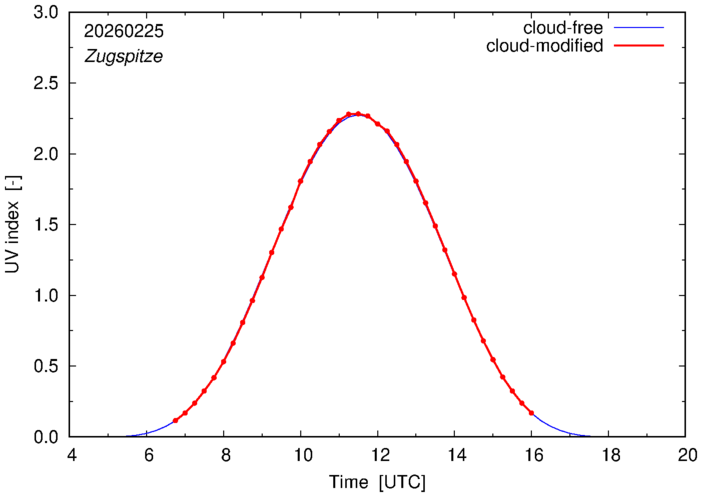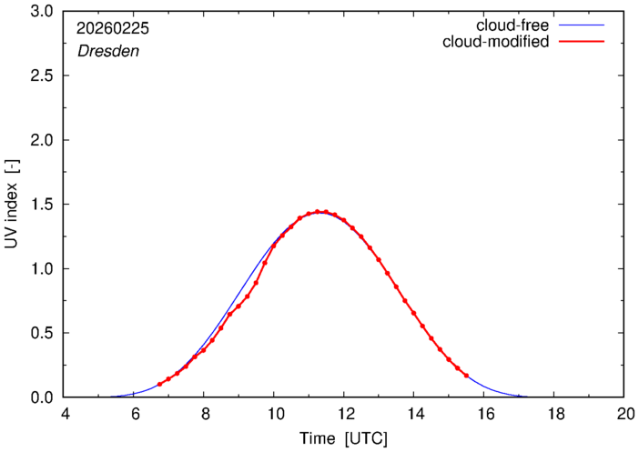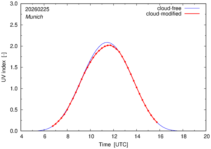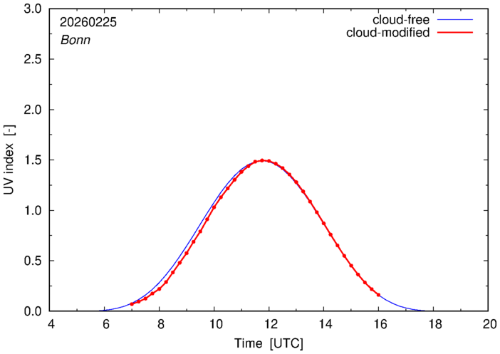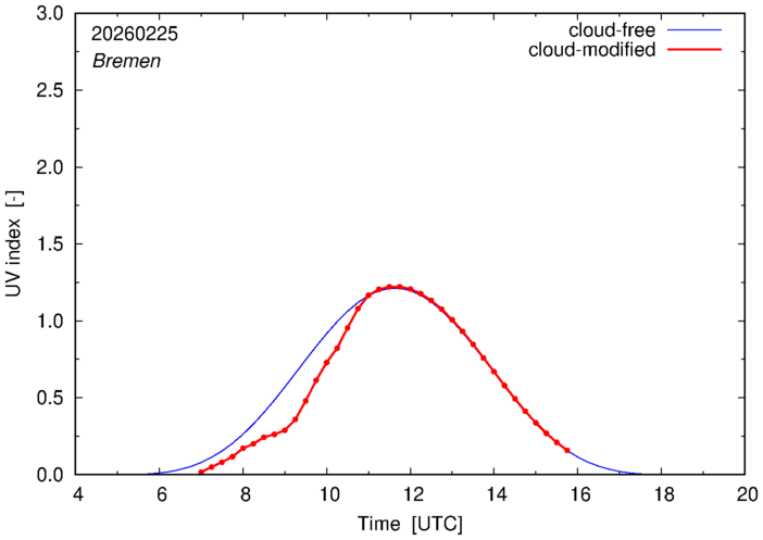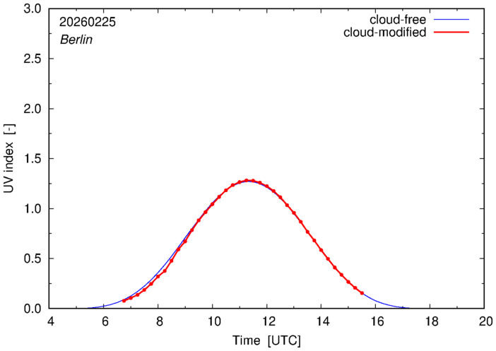 The plots on this page show for selected places in Germany the UV index throughout the day, both cloud-free (thin blue line) and cloud-modified (red line/points) -- if the latter is absent, then cloud cover data is not available.